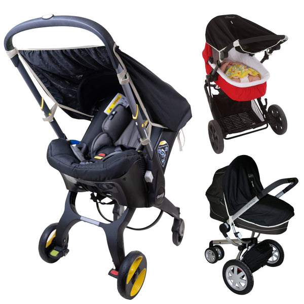 If baby is in a stroller bassinet then it is vital to keep them shaded from the sun at all times. SnoozeShade Original makes this easy to do as it gives complete overhead shade over the top of a stroller bassinet or a car seat stroller like the Doona.