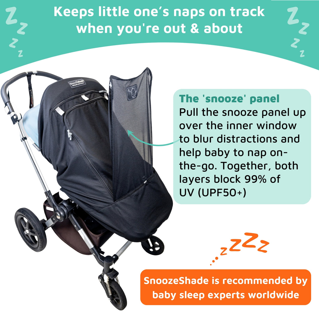 What is the snooze mode? When it’s time for a stroller nap, convert SnoozeShade Plus Extra to snooze mode by zipping up the shade panel and securing the outer snooze panel (an extra layer of mesh) using our baby-safe poppers. This creates a sleep-friendly environment that blurs distractions, shuts out 94% of light and blocks 99% of UV rays (UPF 50+).